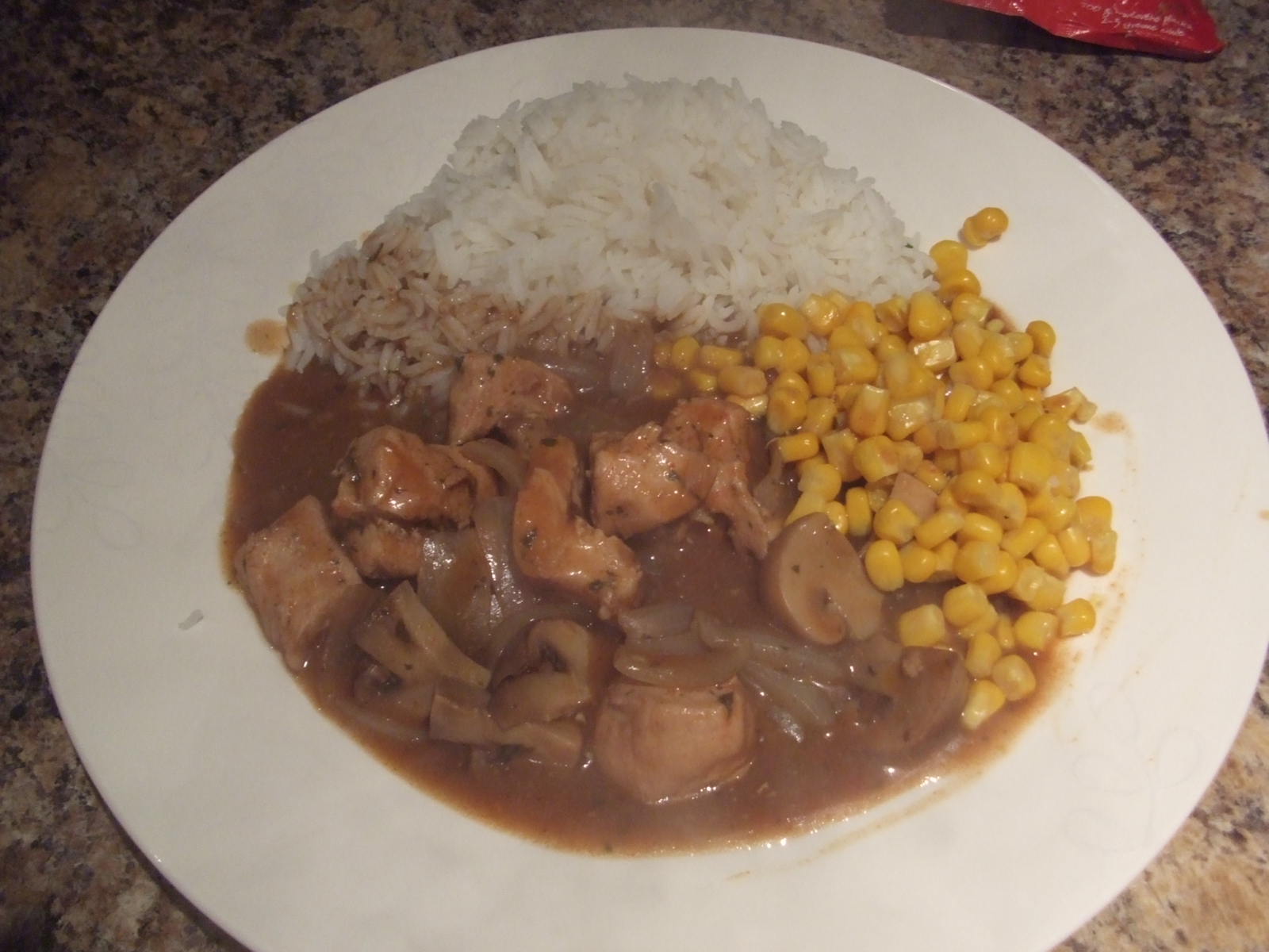 We've just had this for tea, it's a cheats tea as I use a packet mix but I add a couple of my own ingredients and it's so tasty and easy, just shove it all in the oven and wait. I serve it with basmati rice and sweetcorn.